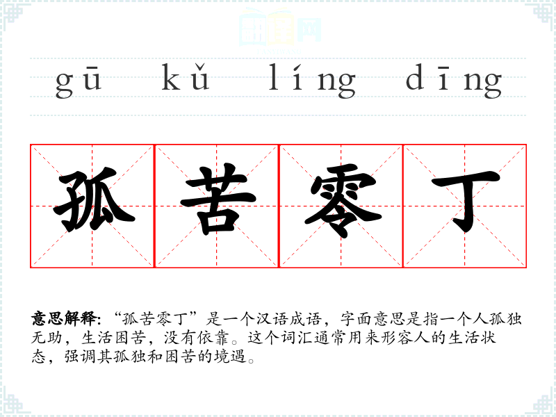 “孤苦零丁”是一个汉语成语,字面意思是指一个人孤独无助,生活困苦,没有依靠。这个词汇通常用来形容人的生活状态,强调其孤独和困苦的境遇。
