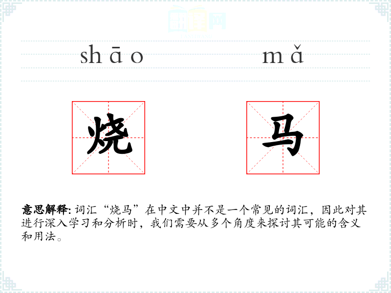 由于“烧马”不是一个常见的词汇,它在不同语境下的使用可能非常有限。如果存在,它可能出现在特定的历史文献、方言研究或特定社群的口语中。
