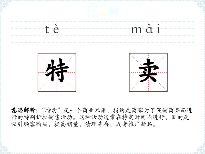 - 专业领域:在商业和市场营销领域,“特卖”是一个常用词汇,用于描述各种促销策略。