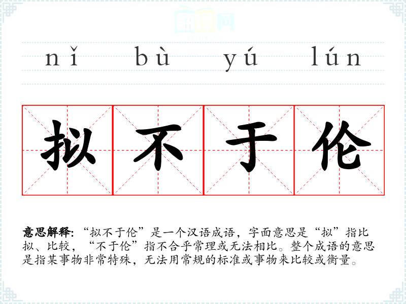 “拟不于伦”是一个汉语成语,字面意思是“拟”指比拟、比较,“不于伦”指不合乎常理或无法相比。整个成语的意思是指某事物非常特殊,无法用常规的标准或事物来比较或衡量。