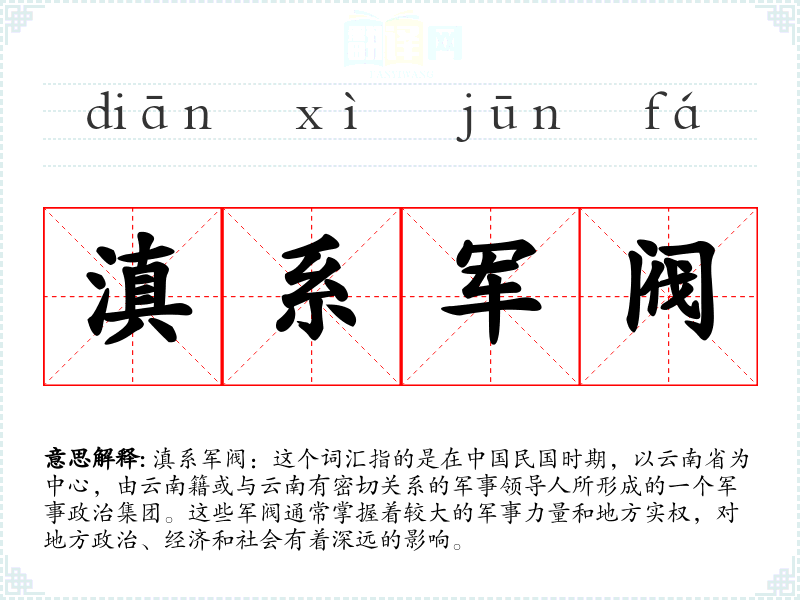 “滇系军阀”一词源于对民国时期地方军事政治集团的命名,其中“滇”指的是云南省,“系”表示一个系统或集团,“军阀”则是指掌握军事力量的政治集团。随着时间的推移,这个词汇被广泛用于历史研究和文学创作中。