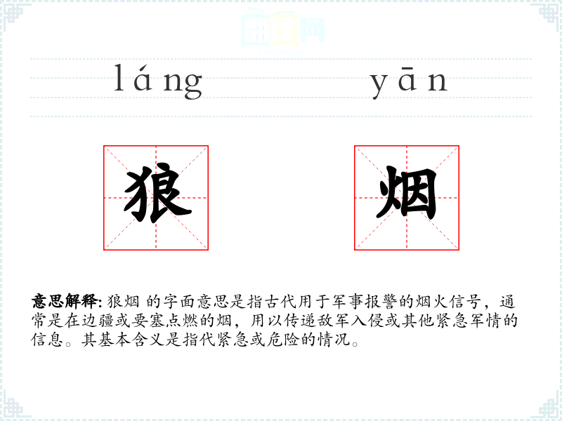 狼烟 的字面意思是指古代用于军事报警的烟火信号,通常是在边疆或要塞点燃的烟,用以传递敌军入侵或其他紧急军情的信息。其基本含义是指代紧急或危险的情况。