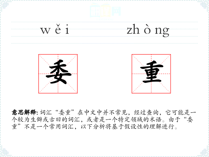 词汇“委重”在中文中并不常见,经过查询,它可能是一个较为生僻或古旧的词汇,或者是一个特定领域的术语。由于“委重”不是一个常用词汇,以下分析将基于假设性的理解进行。