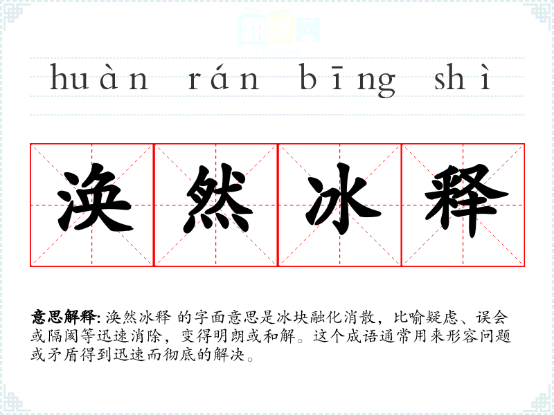 在英语中,类似的表达可能是“melt like ice”或“clear up misunderstandings”,但涣然冰释更具有诗意和形象性。