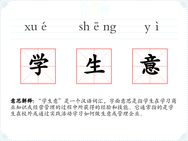 “学生意”是一个汉语词汇,字面意思是指学生在学商业知识或经营管理的过程中所获得的经验和技能。它通常指的是学生在校外或通过实践活动学如何做生意或管理企业。