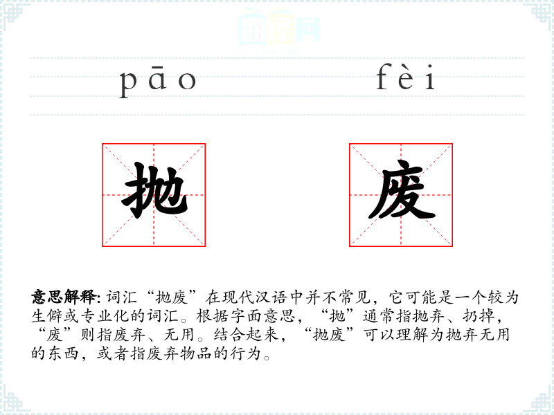 由于“抛废”不是一个常用词汇,其词源和演变信息较少。它可能是由“抛”和“废”两个常用词汇组合而成,用以表达特定的动作和状态。