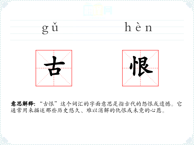 “古恨”这个词汇的字面意思是指古代的怨恨或遗憾。它通常用来描述那些历史悠久、难以消解的仇恨或未竟的心愿。