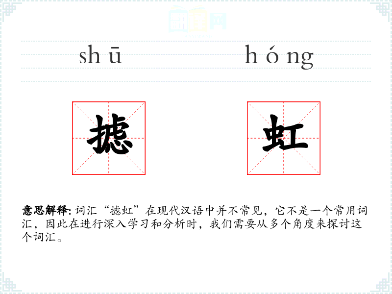 总的来说,“摅虹”这个词在现代汉语中并不常见,它的使用和理解需要结合具体的语境和文学背景。在学习这个词汇时,我们可以通过创造性的方式来探索它的可能含义和用法,同时也要意识到它在日常交流中的实用性有限。