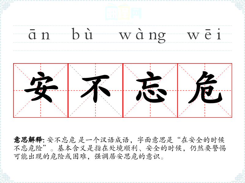 安不忘危 是一个汉语成语,字面意思是“在安全的时候不忘危险”。基本含义是指在处境顺利、安全的时候,仍然要警惕可能出现的危险或困难,强调居安思危的意识。
