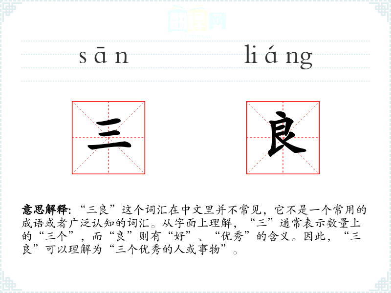 “三良”这个词汇在中文里并不常见,它不是一个常用的成语或者广泛认知的词汇。从字面上理解,“三”通常表示数量上的“三个”,而“良”则有“好”、“优秀”的含义。因此,“三良”可以理解为“三个优秀的人或事物”。