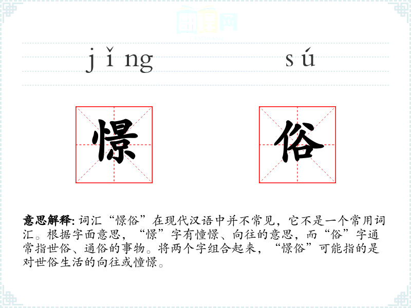 “憬”字源自古代汉语,意为憧憬、向往。“俗”字则一直指世俗、通俗的事物。两个字的组合可能是现代创造的词汇,用以表达特定的情感或态度。