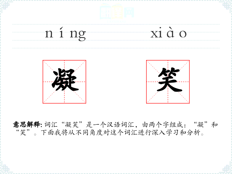 “凝”字源自古代汉语,意为凝结、凝固;“笑”字则表示笑的动作或表情。两个字组合在一起,形成了描述特定表情状态的词汇。