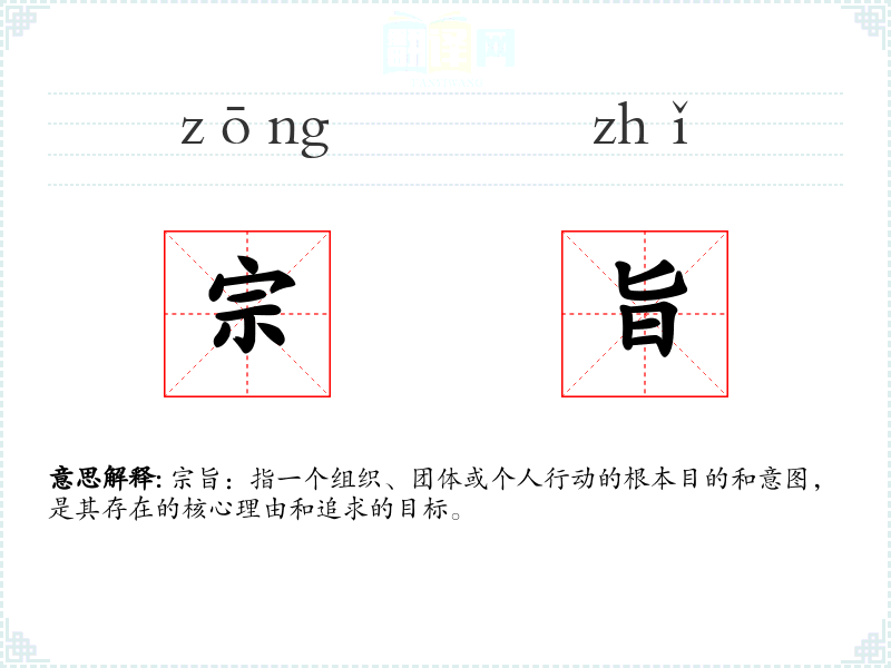 - 反义词:无(宗旨本身是一个正面的词汇,没有直接的反义词)