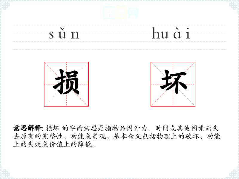 损坏 的字面意思是指物品因外力、时间或其他因素而失去原有的完整性、功能或美观。基本含义包括物理上的破坏、功能上的失效或价值上的降低。
