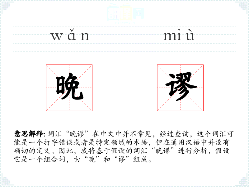 词汇“晚谬”在中文中并不常见,经过查询,这个词汇可能是一个打字错误或者是特定领域的术语,但在通用汉语中并没有确切的定义。因此,我将基于假设的词汇“晚谬”进行分析,假设它是一个组合词,由“晚”和“谬”组成。