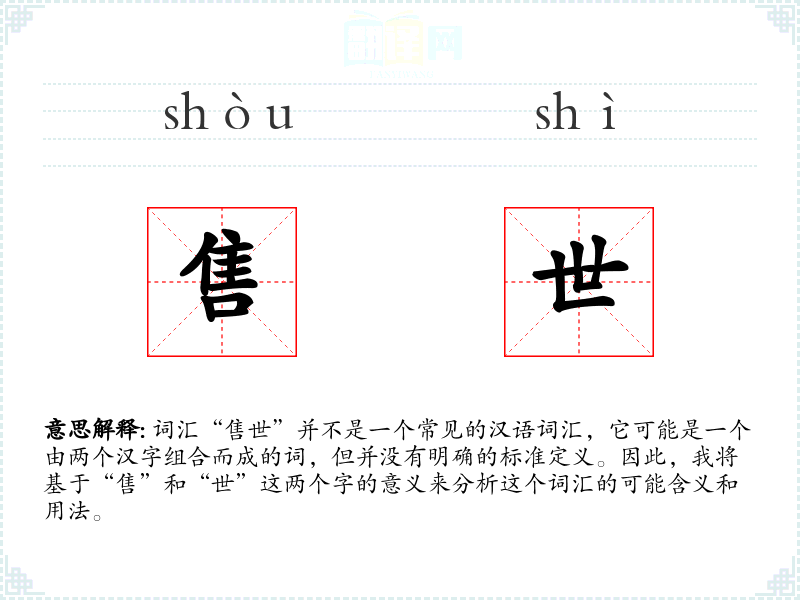 词汇“售世”并不是一个常见的汉语词汇,它可能是一个由两个汉字组合而成的词,但并没有明确的标准定义。因此,我将基于“售”和“世”这两个字的意义来分析这个词汇的可能含义和用法。