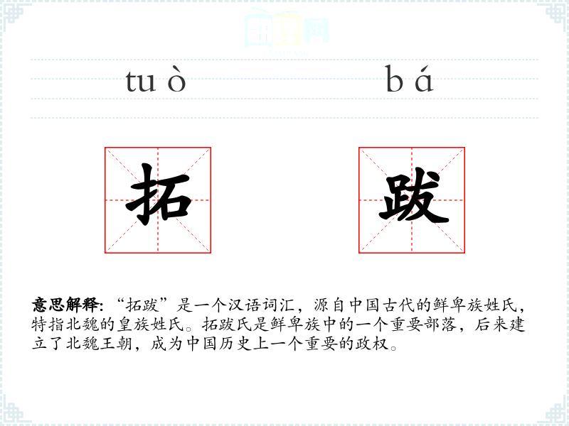 “拓跋”是一个汉语词汇,源自古代的鲜卑族姓氏,特指北魏的皇族姓氏。拓跋氏是鲜卑族中的一个重要部落,后来建立了北魏王朝,成为历史上一个重要的政权。