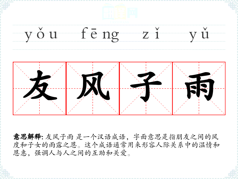 友风子雨 是一个汉语成语,字面意思是指朋友之间的风度和子女的雨露之恩。这个成语通常用来形容人际关系中的温情和恩惠,强调人与人之间的互助和关爱。