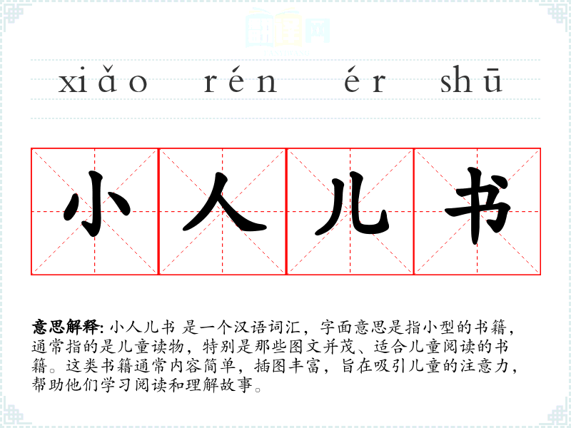 小人儿书 是一个汉语词汇,字面意思是指小型的书籍,通常指的是儿童读物,特别是那些图文并茂、适合儿童阅读的书籍。这类书籍通常内容简单,插图丰富,旨在吸引儿童的注意力,帮助他们学*阅读和理解故事。