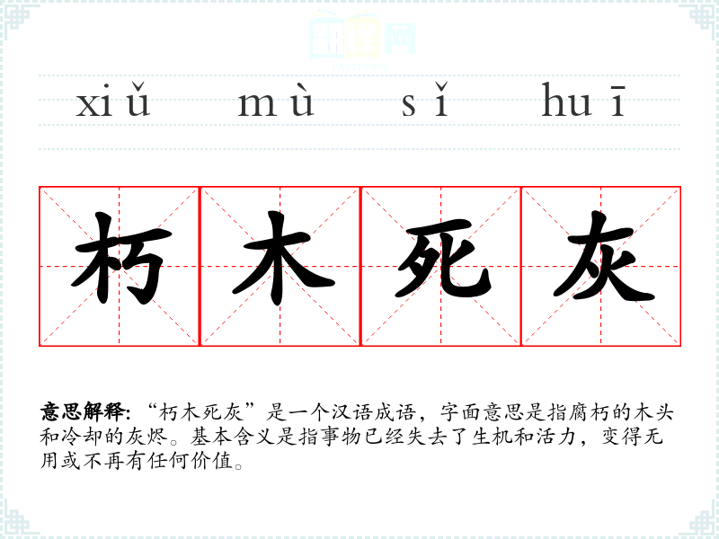 “朽木死灰”是一个汉语成语,字面意思是指腐朽的木头和冷却的灰烬。基本含义是指事物已经失去了生机和活力,变得无用或不再有任何价值。