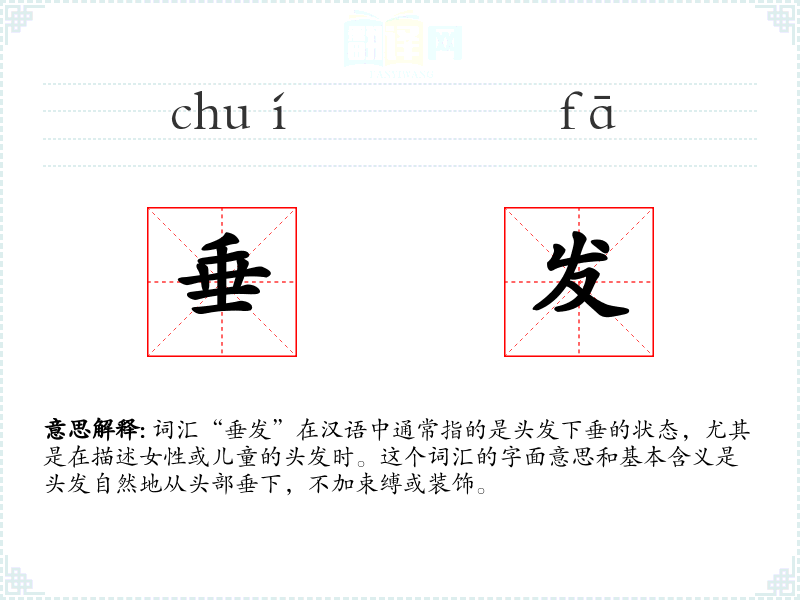 词汇“垂发”在汉语中通常指的是头发下垂的状态,尤其是在描述女性或儿童的头发时。这个词汇的字面意思和基本含义是头发自然地从头部垂下,不加束缚或装饰。
