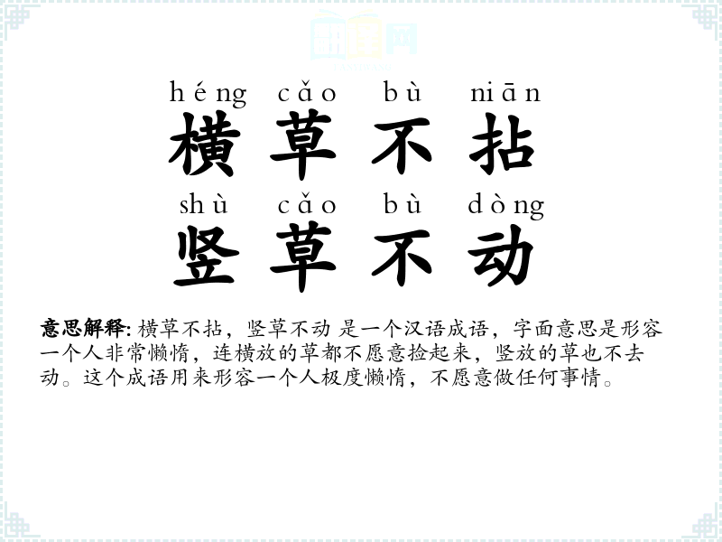 横草不拈,竖草不动 是一个汉语成语,字面意思是形容一个人非常懒惰,连横放的草都不愿意捡起来,竖放的草也不去动。这个成语用来形容一个人极度懒惰,不愿意做任何事情。