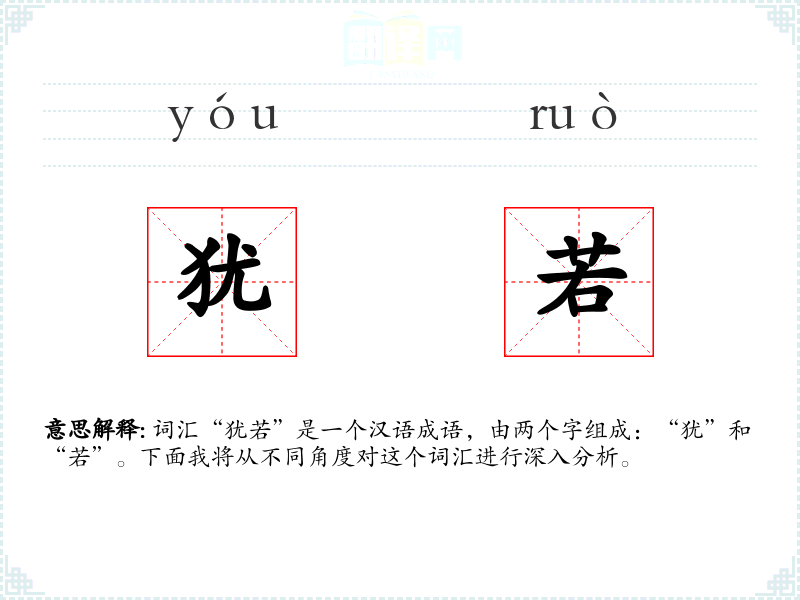 词汇“犹若”是一个汉语成语,由两个字组成:“犹”和“若”。下面我将从不同角度对这个词汇进行深入分析。