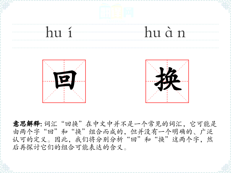 词汇“回换”在中文中并不是一个常见的词汇,它可能是由两个字“回”和“换”组合而成的,但并没有一个明确的、广泛认可的定义。因此,我们将分别分析“回”和“换”这两个字,然后再探讨它们的组合可能表达的含义。