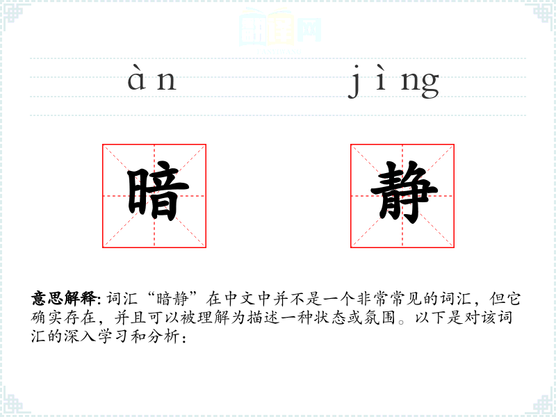 词汇“暗静”在中文中并不是一个非常常见的词汇,但它确实存在,并且可以被理解为描述一种状态或氛围。以下是对该词汇的深入学习和分析:
