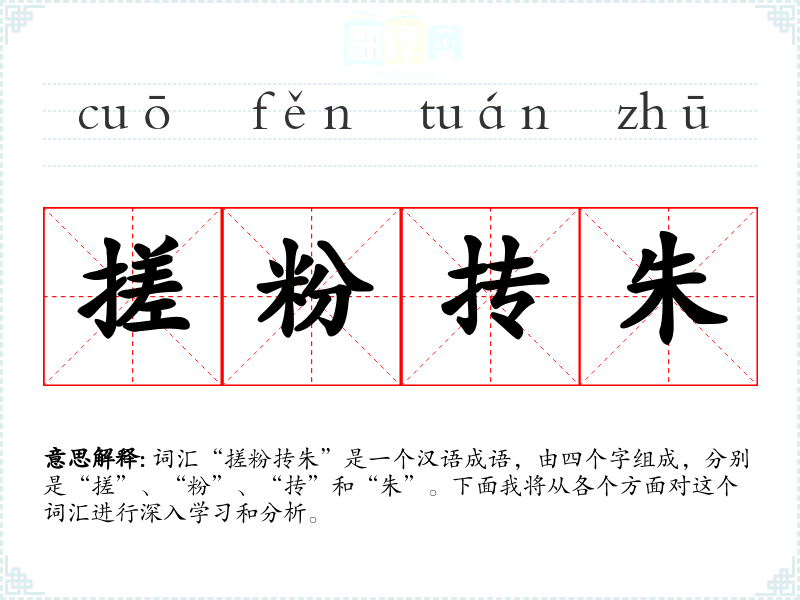 词汇“搓粉抟朱”是一个汉语成语,由四个字组成,分别是“搓”、“粉”、“抟”和“朱”。下面我将从各个方面对这个词汇进行深入学*和分析。