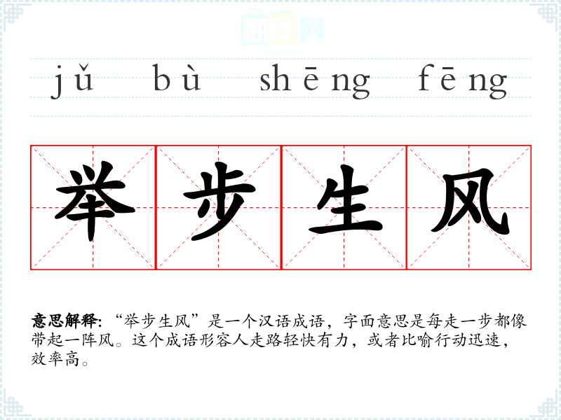 “举步生风”是一个汉语成语,字面意思是每走一步都像带起一阵风。这个成语形容人走路轻快有力,或者比喻行动迅速,效率高。