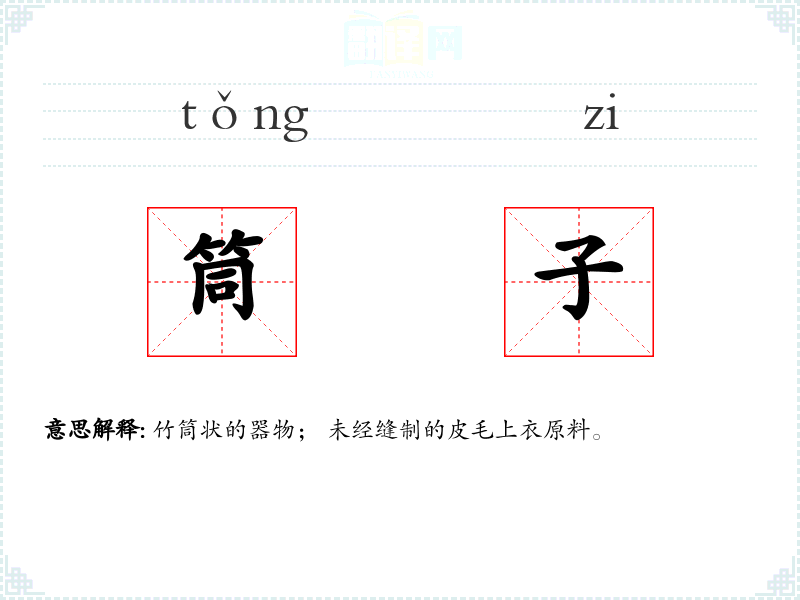 竹筒状的器物; 未经缝制的皮毛上衣原料。