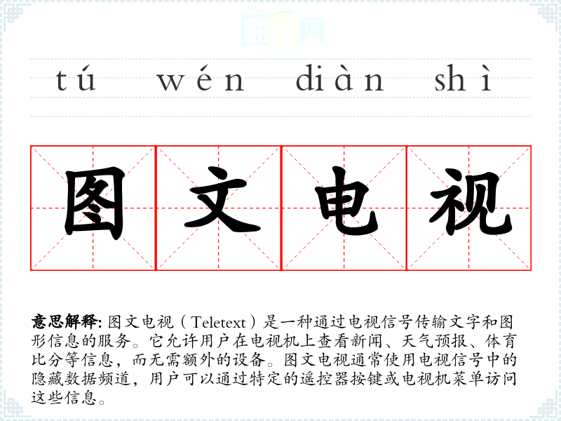 图文电视作为一种过时的信息传输技术,虽然在现代社会中已经被取代,但它代表了技术发展的一个阶段,对于理解信息传播的历史和技术演变具有重要意义。在语言学习和表达中,了解这样的词汇可以帮助我们更好地理解不同时代的文化和技术背景。