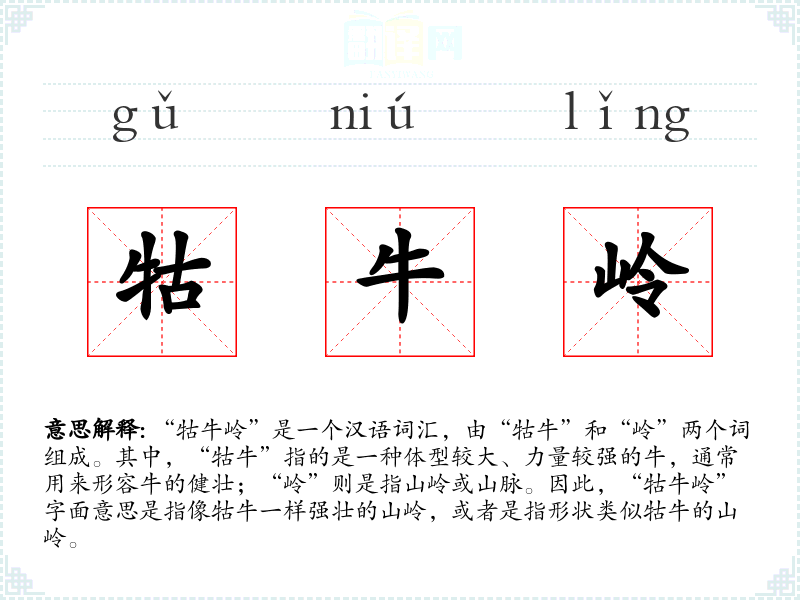 “牯牛岭”是一个汉语词汇,由“牯牛”和“岭”两个词组成。其中,“牯牛”指的是一种体型较大、力量较强的牛,通常用来形容牛的健壮;“岭”则是指山岭或山脉。因此,“牯牛岭”字面意思是指像牯牛一样强壮的山岭,或者是指形状类似牯牛的山岭。