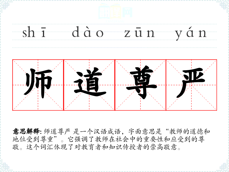 师道尊严 是一个汉语成语,字面意思是“教师的道德和地位受到尊重”。它强调了教师在社会中的重要性和应受到的尊敬。这个词汇体现了对教育者和知识传授者的崇高敬意。