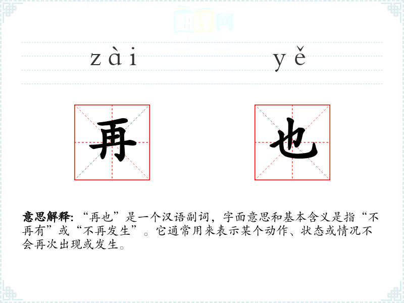 “再也”是一个汉语副词,字面意思和基本含义是指“不再有”或“不再发生”。它通常用来表示某个动作、状态或情况不会再次出现或发生。