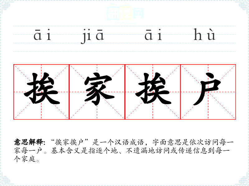 “挨家挨户”是一个汉语成语,字面意思是依次访问每一家每一户。基本含义是指逐个地、不遗漏地访问或传递信息到每一个家庭。