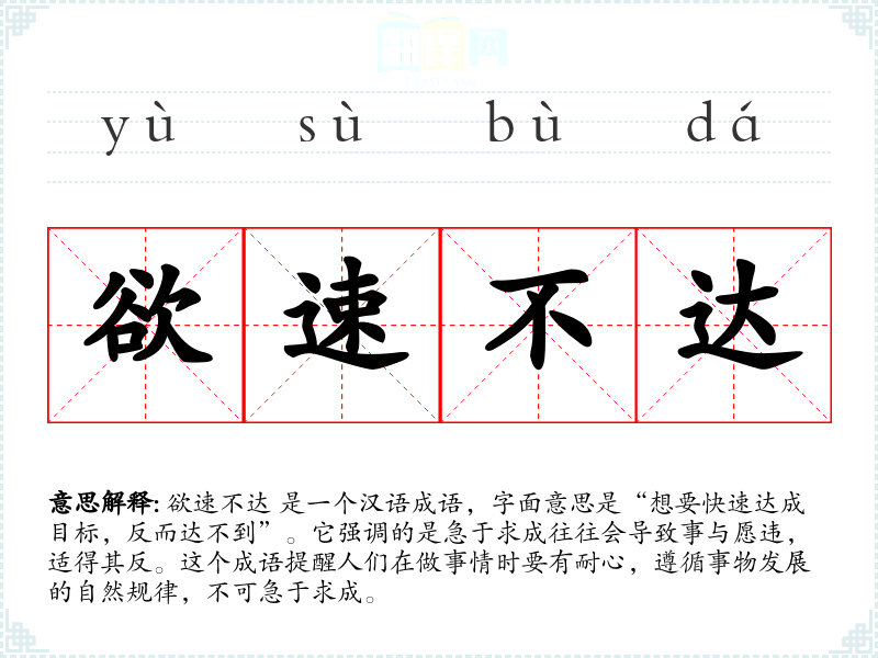 欲速不达 是一个汉语成语,字面意思是“想要快速达成目标,反而达不到”。它强调的是急于求成往往会导致事与愿违,适得其反。这个成语提醒人们在做事情时要有耐心,遵循事物发展的自然规律,不可急于求成。