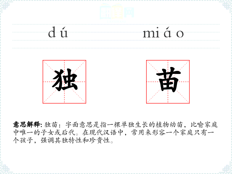独苗:字面意思是指一棵单独生长的植物幼苗,比喻家庭中唯一的子女或后代。在现代汉语中,常用来形容一个家庭只有一个孩子,强调其独特性和珍贵性。