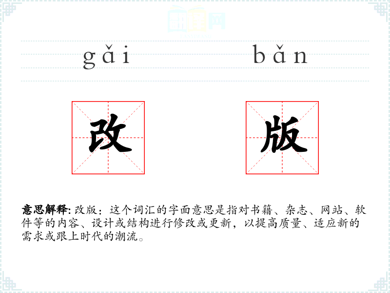 改版:这个词汇的字面意思是指对书籍、杂志、网站、软件等的内容、设计或结构进行修改或更新,以提高质量、适应新的需求或跟上时代的潮流。