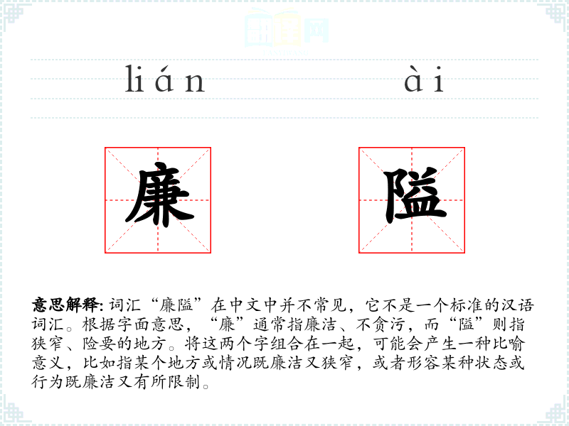 “廉隘”这个词汇可能是由“廉”和“隘”两个字组合而成,但在现代汉语中并没有明确的词源和演变记录。