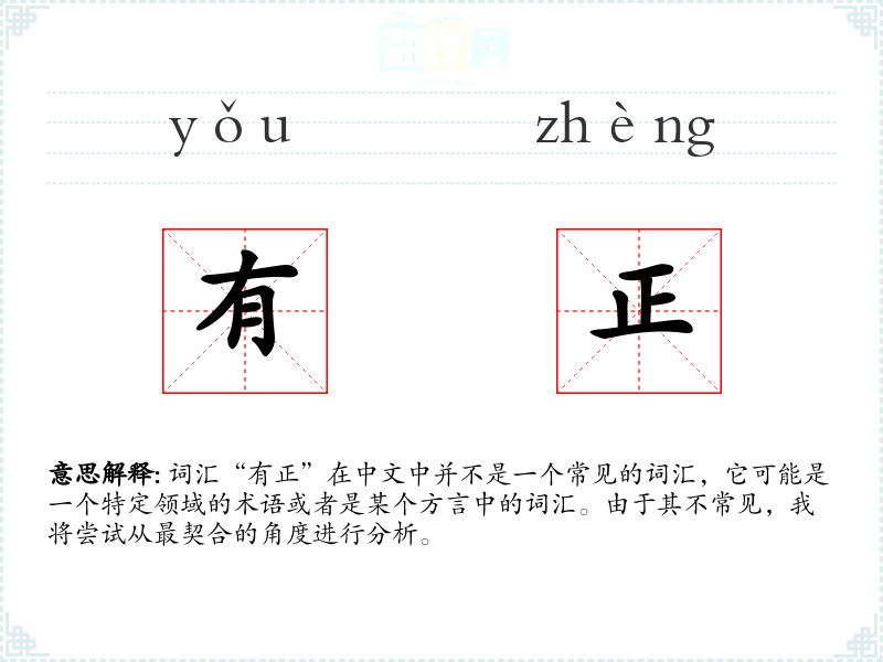 由于“有正”不是一个标准词汇,它在不同语境下的使用可能非常有限。在某些专业领域或特定社群中,它可能有特定的含义。