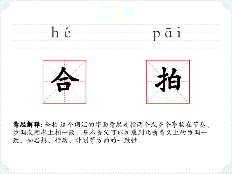 合拍 这个词汇的字面意思是指两个或多个事物在节奏、步调或频率上相一致。基本含义可以扩展到比喻意义上的协调一致,如思想、行动、计划等方面的一致性。
