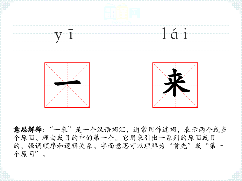 “一来”是一个汉语词汇,通常用作连词,表示两个或多个原因、理由或目的中的第一个。它用来引出一系列的原因或目的,强调顺序和逻辑关系。字面意思可以理解为“首先”或“第一个原因”。