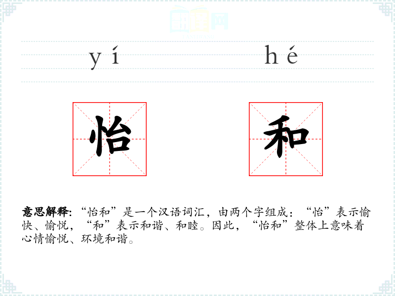 “怡和”是一个汉语词汇,由两个字组成:“怡”表示愉快、愉悦,“和”表示和谐、和睦。因此,“怡和”整体上意味着心情愉悦、环境和谐。