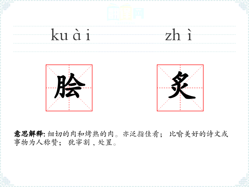 细切的肉和烤熟的肉。亦泛指佳肴; 比喻美好的诗文或事物为人称赞; 犹宰割﹐处置。