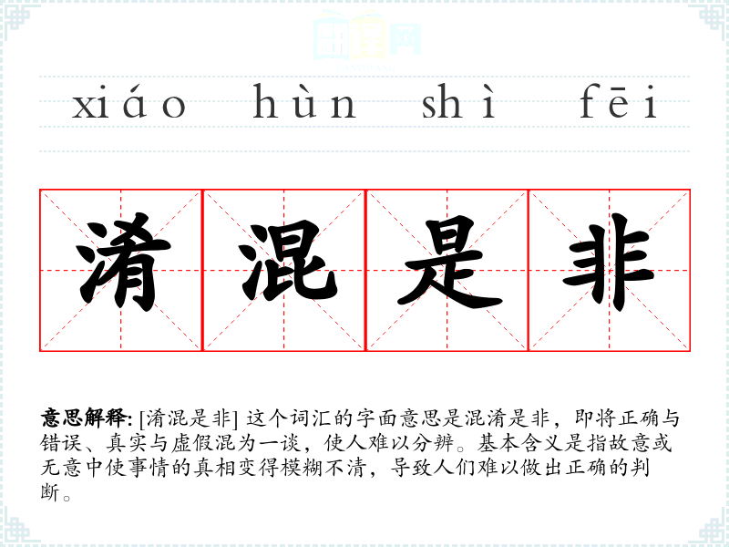 [淆混是非] 这个词汇的字面意思是混淆是非,即将正确与错误、真实与虚假混为一谈,使人难以分辨。基本含义是指故意或无意中使事情的真相变得模糊不清,导致人们难以做出正确的判断。
