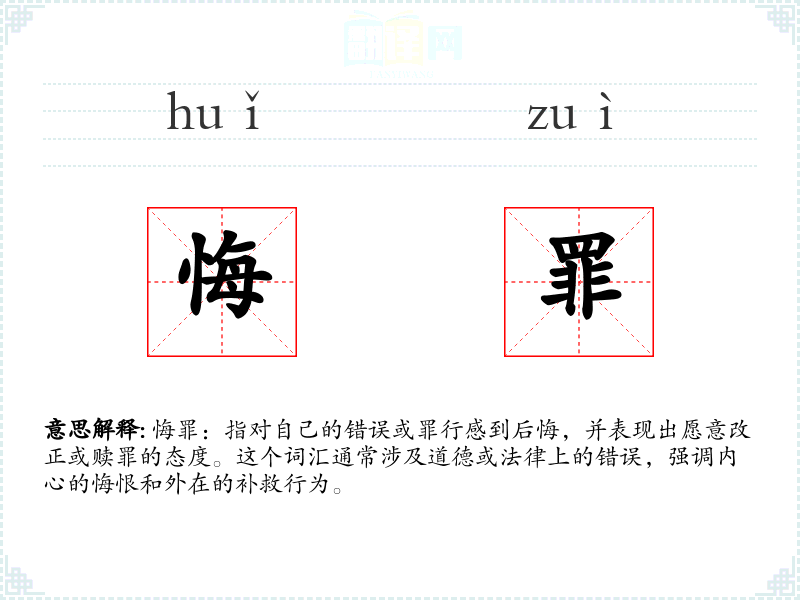 悔罪:指对自己的错误或罪行感到后悔,并表现出愿意改正或赎罪的态度。这个词汇通常涉及道德或法律上的错误,强调内心的悔恨和外在的补救行为。