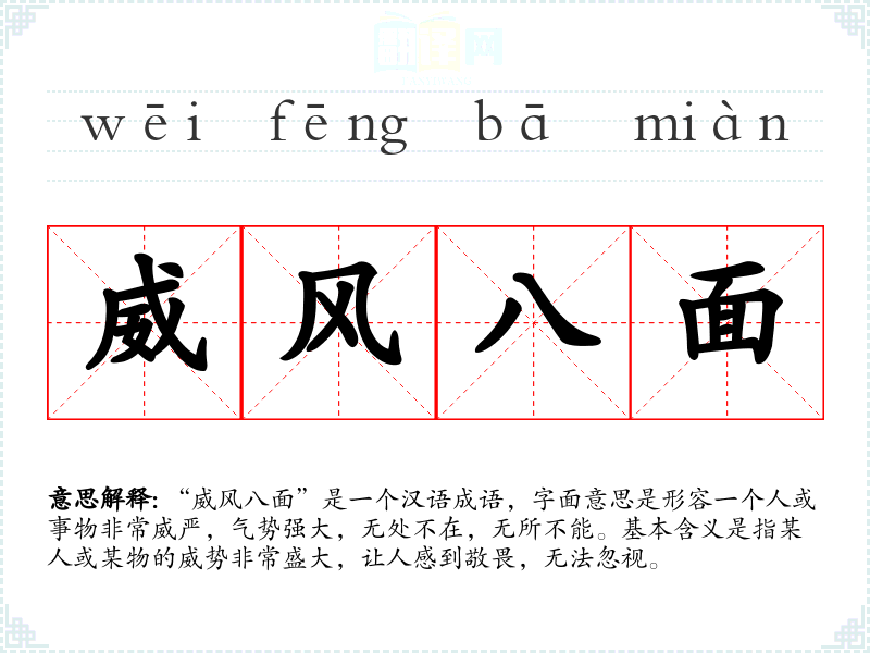 “威风八面”是一个汉语成语,字面意思是形容一个人或事物非常威严,气势强大,无处不在,无所不能。基本含义是指某人或某物的威势非常盛大,让人感到敬畏,无法忽视。