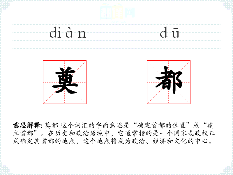 奠都 这个词汇的字面意思是“确定首都的位置”或“建立首都”。在历史和政治语境中,它通常指的是一个国家或政权正式确定其首都的地点,这个地点将成为政治、经济和文化的中心。